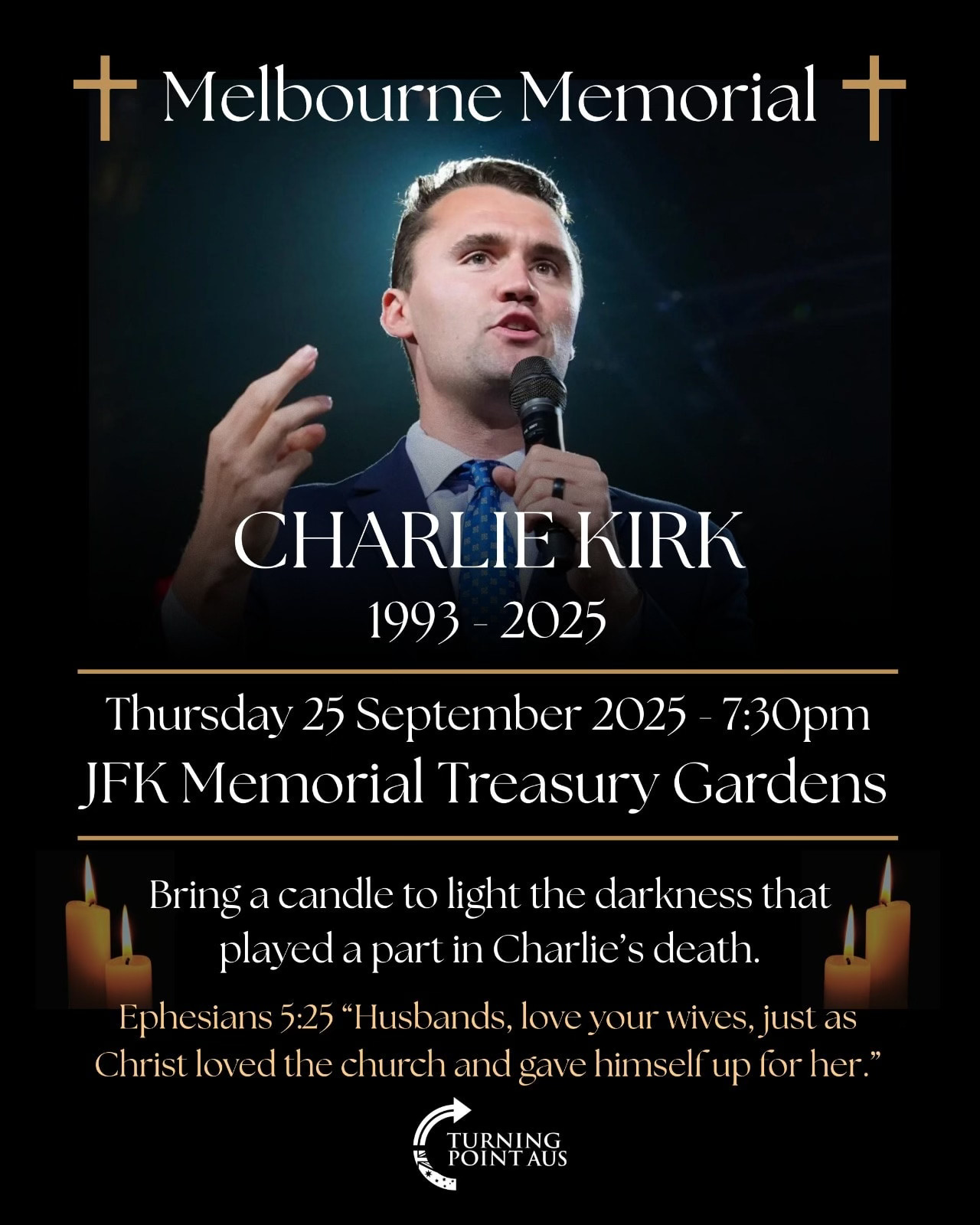 This Thursday 25 September we gather in Melbourne to honour the life of Charlie Kirk. A chance not only to celebrate his legacy, but also to stand together and connect with fellow conservatives.