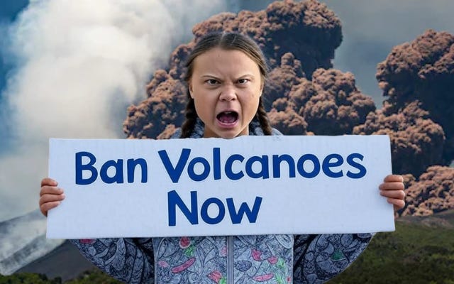 Some are even calling for a ban on volcanoes. Presumably with a UN resolution and a strongly worded change.org petition. Pour concrete in them, they cry! Carbon offsets for magma! It's a cult, just without the catchy robes.