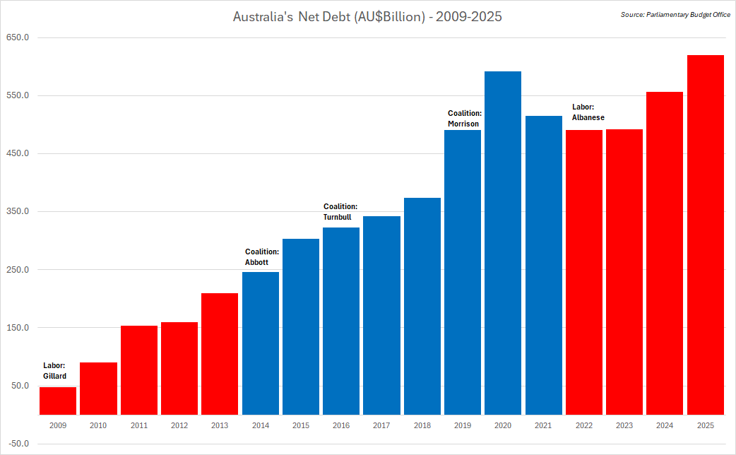 Both major parties - the Labor Party and the Liberal-National Coalition - are equally responsible for the same reckless behaviour: economic vandalism. The chart is clear for all to see. Year after year, government after government, red or blue it doesn’t matter, the debt keeps going up.