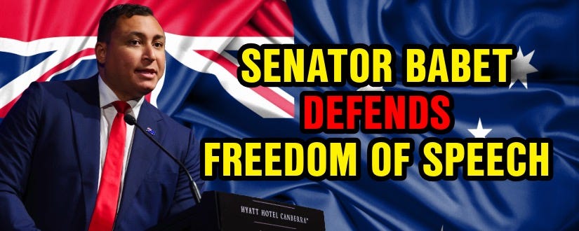Yes indeed, Senator Babet, you are right on the money in introducing a bill into Parliament to encourage more free speech in Australia. However, you are a lone voice and your bill has zilch chance of getting anywhere. The current situation favors ALL the party's that infest today's politically correct rock show mob in the Canberra house of horrors. The last thing the majors want is for people to express their opinions freely and honestly. Nevertheless we will give you full marks for trying even though we know what the outcome will be. In any case keep being a thorn in their sides and speaking up as you see the current wickedness increasing in intensity.
